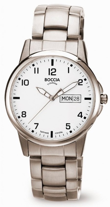 Elegantna moška zelo pregledna ročna ura Boccia Titanium 604-09 s sivim ohišjem in paščkom iz titana je pravi dodatek za vsak stil. Belo številčnico krasijo velike črne številke, kar uro naredi bolj vidno. Primerna je za vse priložnosti.