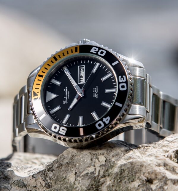 Moška ura nemškega proizvajalca Eichmuller, ki jo odlikuje klasična in preprosta oblika. Številčnica je bogata z kontrastom in zagotavlja optimalno vidljivost in je zaščitena pred zunanjimi vplivi s kaljenim mineralnim steklom. Tako krona kot hrbtna stran ohišja sta trdno privita, kar pomeni , da ta ura zdrži pritisk vode do 20 barov.