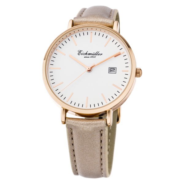 Elegantna ženska ura nemškega proizvajalce Eichmuller. Odlikuje jo pregledna številčnica v barvi rose gold, z datumom in elegantnim usnjenim pasom. Prava izbira za vse priložnosti.
