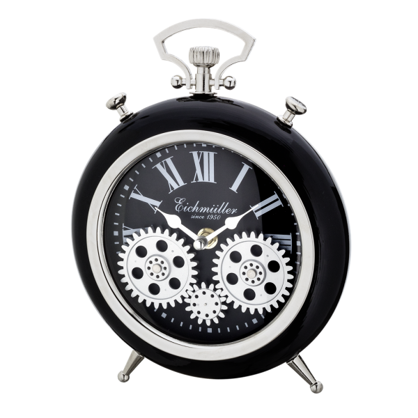 Namizna ura z izgledom budilke. Sprednja stran z vrtečimi zobniki deluje, kot pogled v notranjost ure. Za delovanje ure so potrebne tri baterije (LR-6)