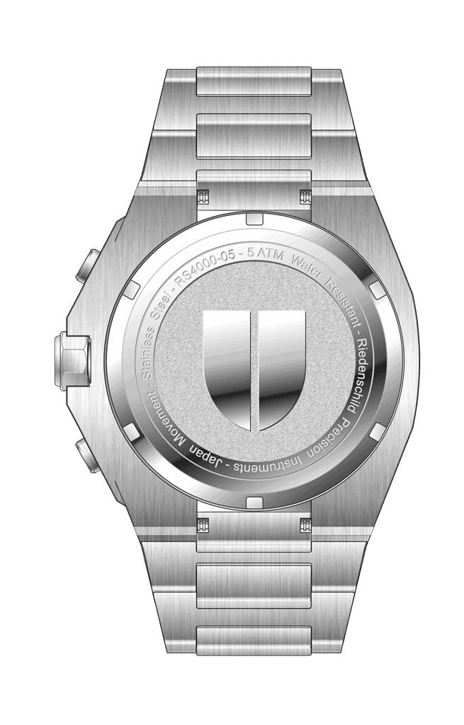 Blagovna znamka Riedenschild je relativno mlada blagovna znamka, ki spada v ure znamke Eichmüller. Za ure Riedenschild je značilna neodvisna zasnova, kvalitetni materiali in precizna izdelava. Pri tem modelu ure se eleganca srečuje z udobjem in zapleteno tehnologijo. Kronograf ura podjetja Riedenschild je opremljen s tahimetrom in prikazom datuma. Temno mrežno številčnico odlikuje filigranska izdelava in je zaščitena z kaljenim mineralnim steklom. Uro poganja natančen kvarčni mehanizem . Brušeno in polirano ohišje je izdelano iz nerjavečega jekla. Vodoodpornost je 5 ATM in je zato primerna tudi za rahel stik z vodo. Kovinska zapestnica je opremljena z varnostno zaponko.